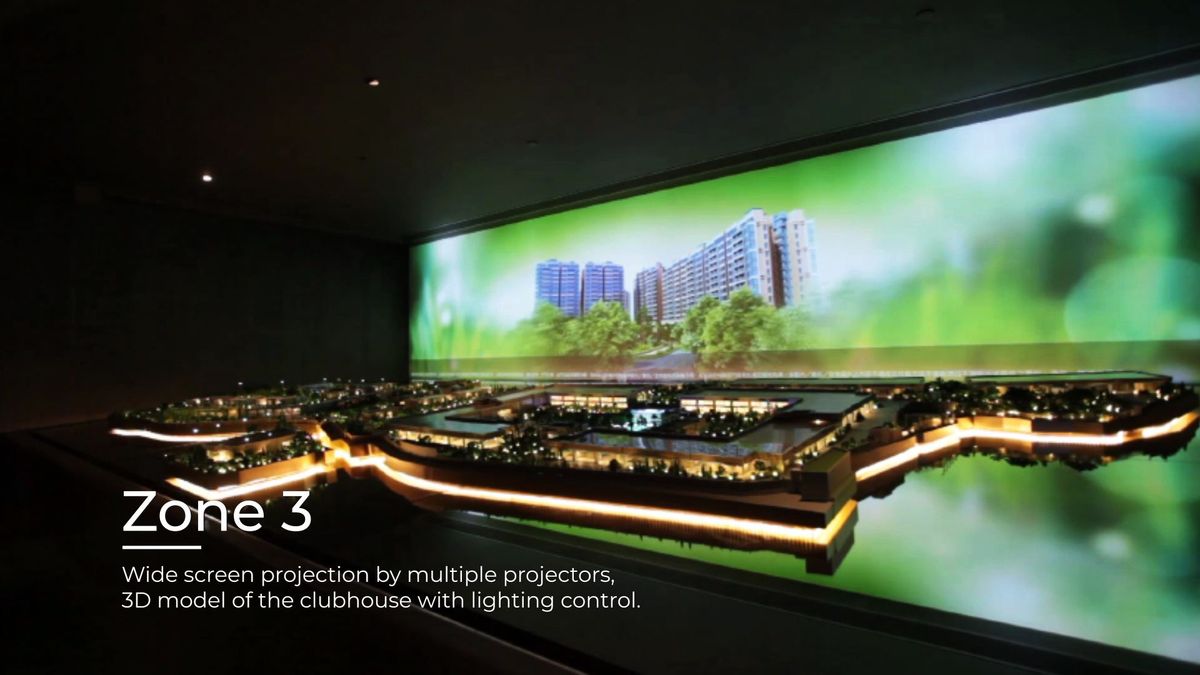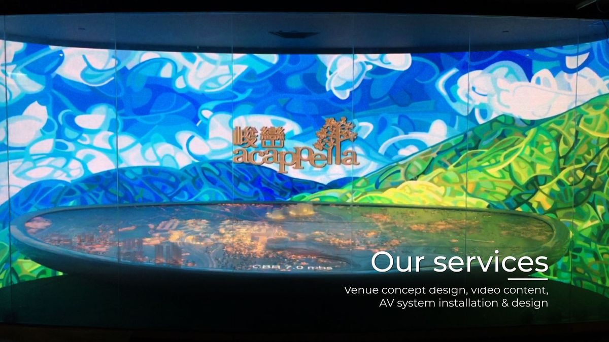 Technical features : Multiple projectors edge blending, LED display, 3D model with lighting control